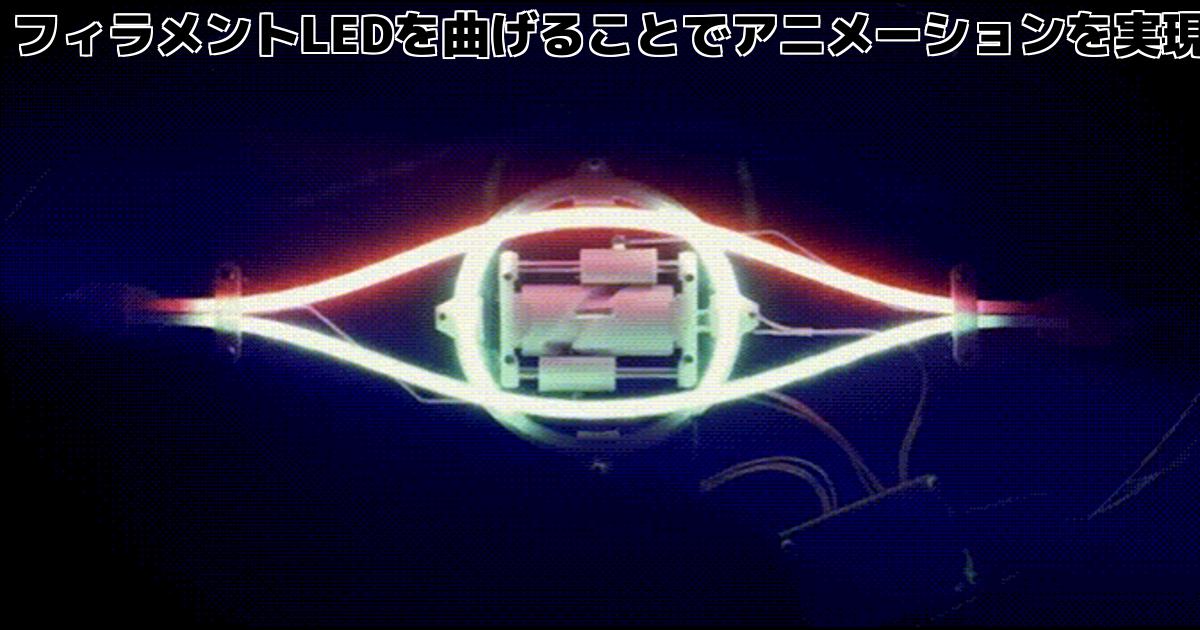 ふにゃふにゃ曲げることが出来るフィラメントLEDを使って、ネオンサインのような表示機を作ることが出来ますが、この作例では、これをさらに応用して一風変わったアニメーションを実現しています。